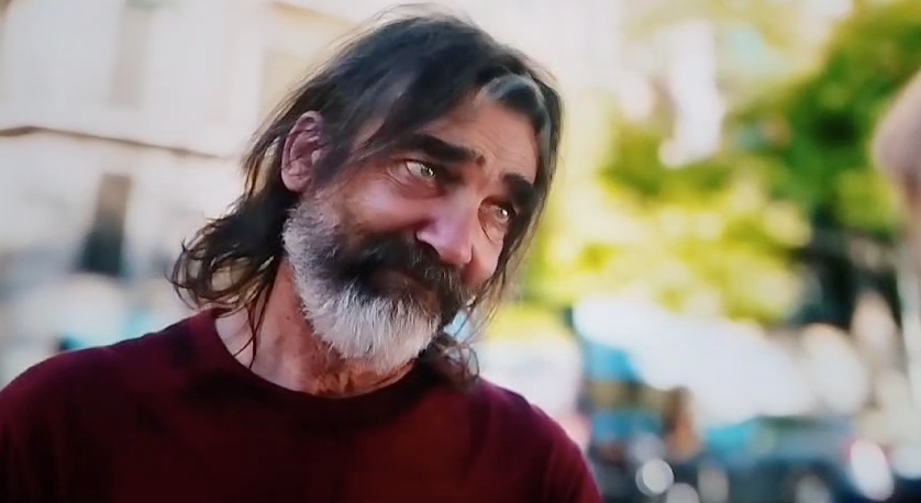 Alfonso Desentre interpreta con humor y ternura a un chaplinesco vagabundo con el que se encuentra Merche y que dará inicio a la gran transformación de la protagonista.